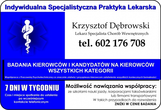 Przeprowadzam badania lekarskie kierowców i kandydatów na kierowców wszystkich kategorii od ponad 12 lat i posiadam spore doświadczenie w tej dziedzinie. W razie potrzeby istnieje możliwość spotkania w dni świąteczne i wolne od pracy, również wieczorem. Każda wizyta czy spotkanie po wcześniejszym kontakcie telefonicznym. Współpracuję już z kilkoma szkołami nauki jazdy czy korporacjami taksówkarskimi. Z opinii, które do mnie docierają, wszyscy są zadowoleni. U mnie oszczędzisz przede wszystkim czas, niepotrzebną stratę pieniędzy na   robienie zbędnych badań i oczywiście masz możliwość spotkania w godzinach popołudniowych oraz dni wolne. Serdecznie zapraszam i zachęcam. Koszt badania uzależniony od posiadanej kategorii prawa jazdy.                Tel. 602 176 708.